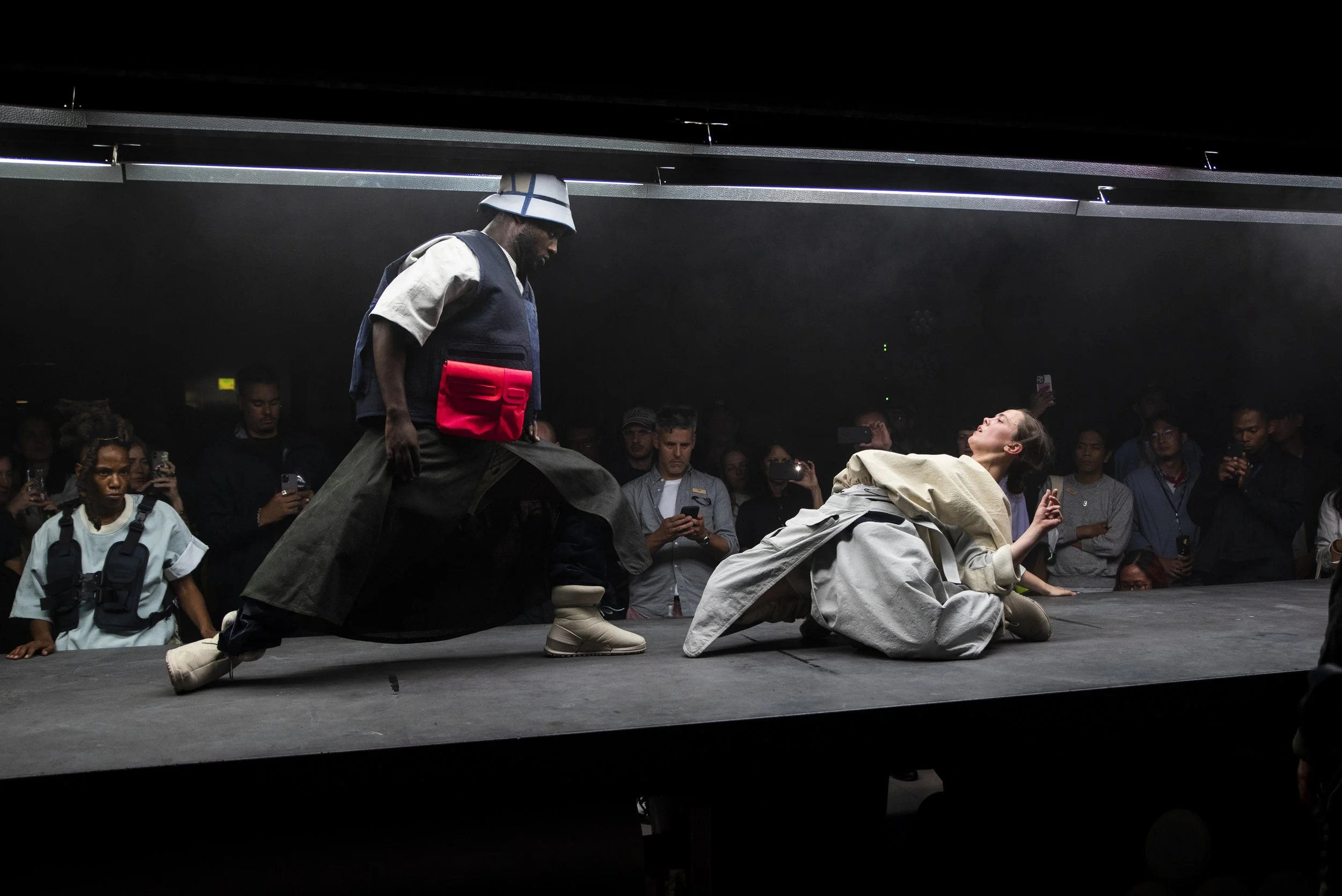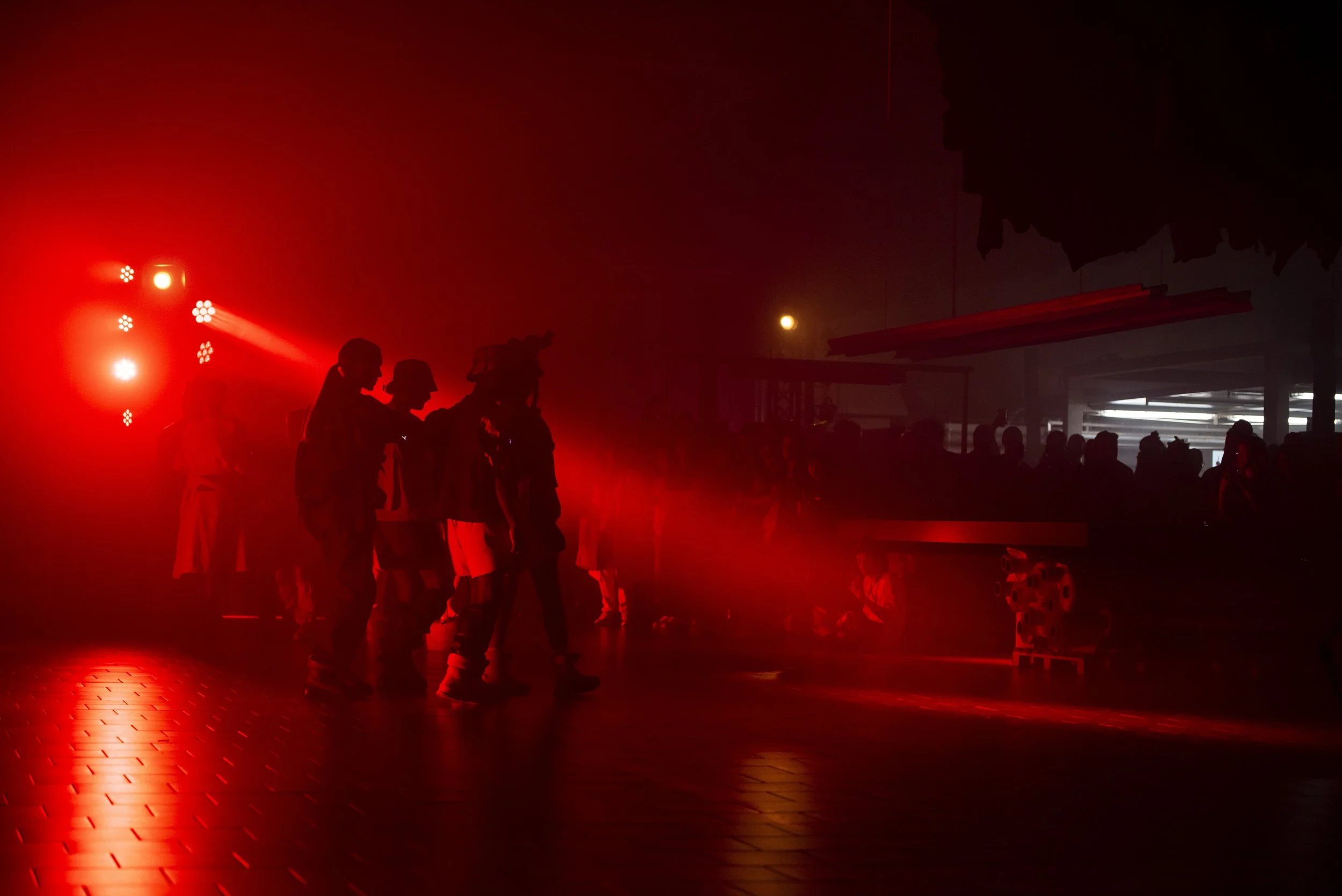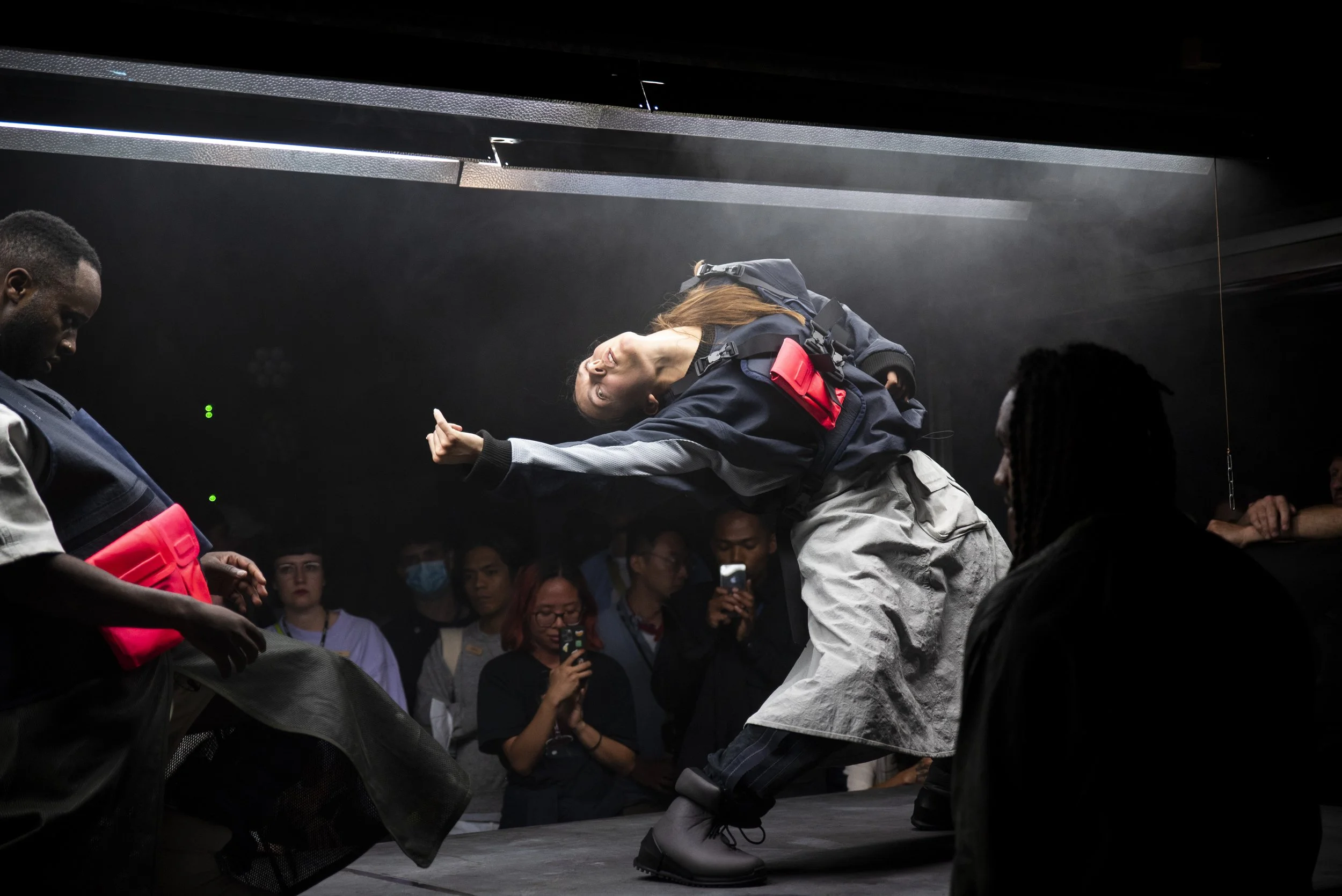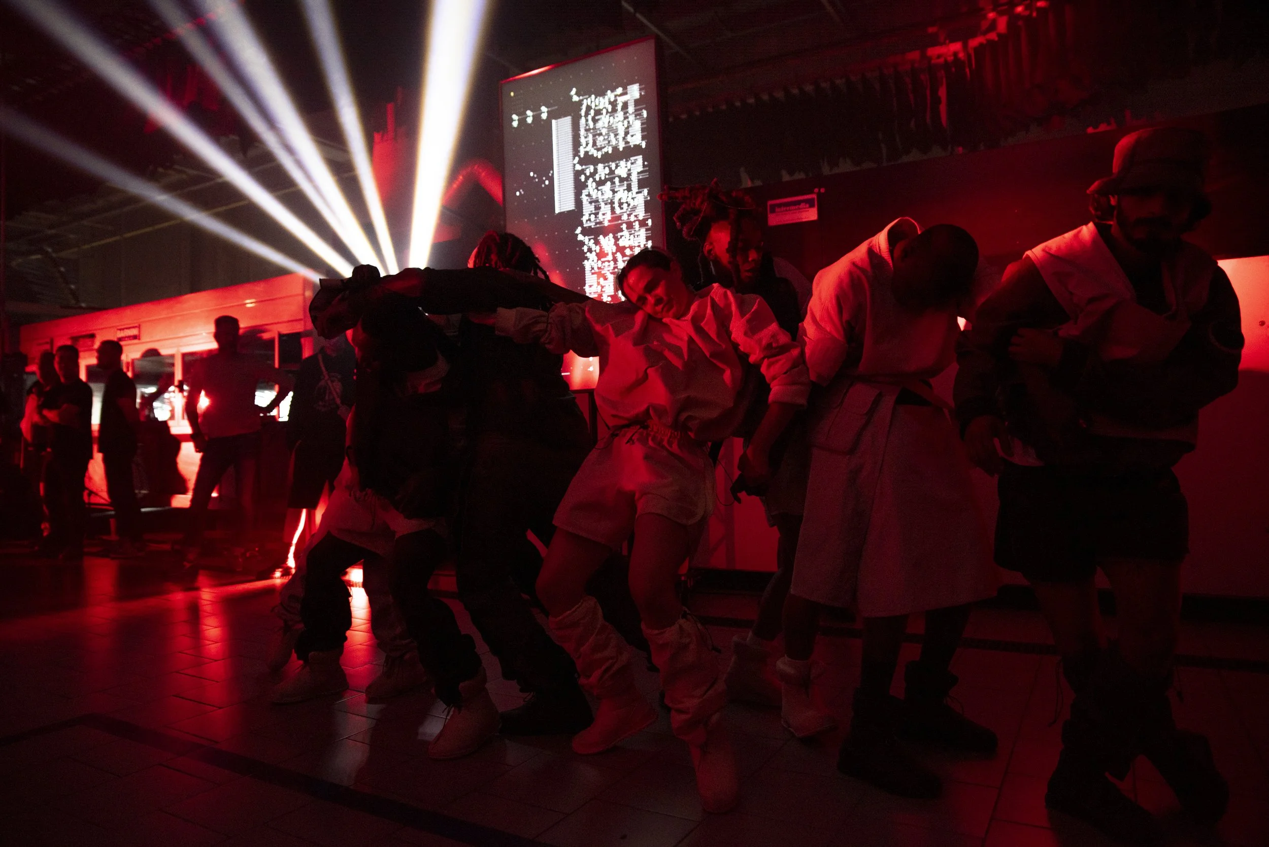 Accompanied by a custom-generated soundtrack, the 10 performers echoed and improvised upon their surroundings. Their movements evolved dynamically in real time, guided by fractal feedback from haptic sensors attached to their bodies, creating an immersive and innovative performance.