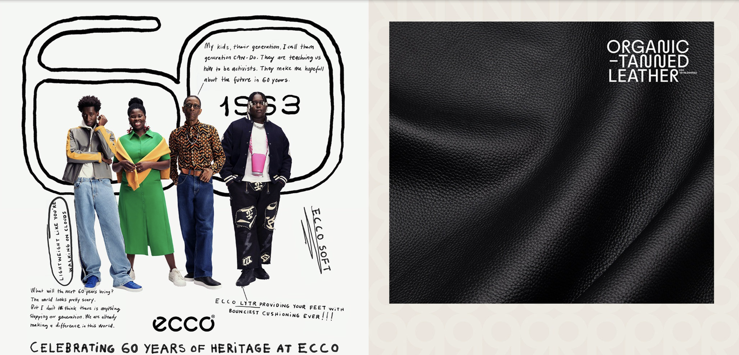 ECCO Leather's Organic Tanned Leather, a sustainable innovation, required a unique visual language and branding to set it apart across channels, including the website and social media. The distinctive environment we created highlights our content and collaborations with other brands. Our goal was to develop a standout graphic identity that not only captures attention but also embodies the reliability of the technology. This consistent theme runs through all Organic Tanned Leather communications, delivering a cohesive and engaging experience for our audience.
